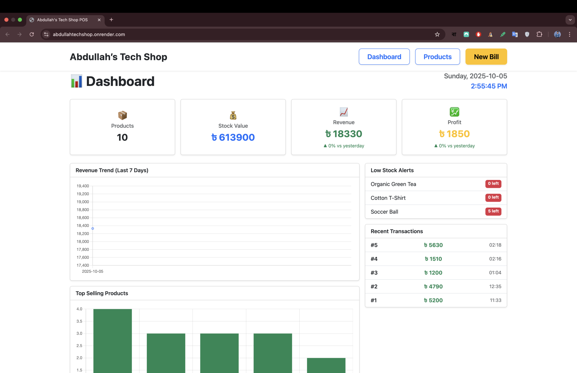 🧾 recent transactions (you can click one to view its bill).